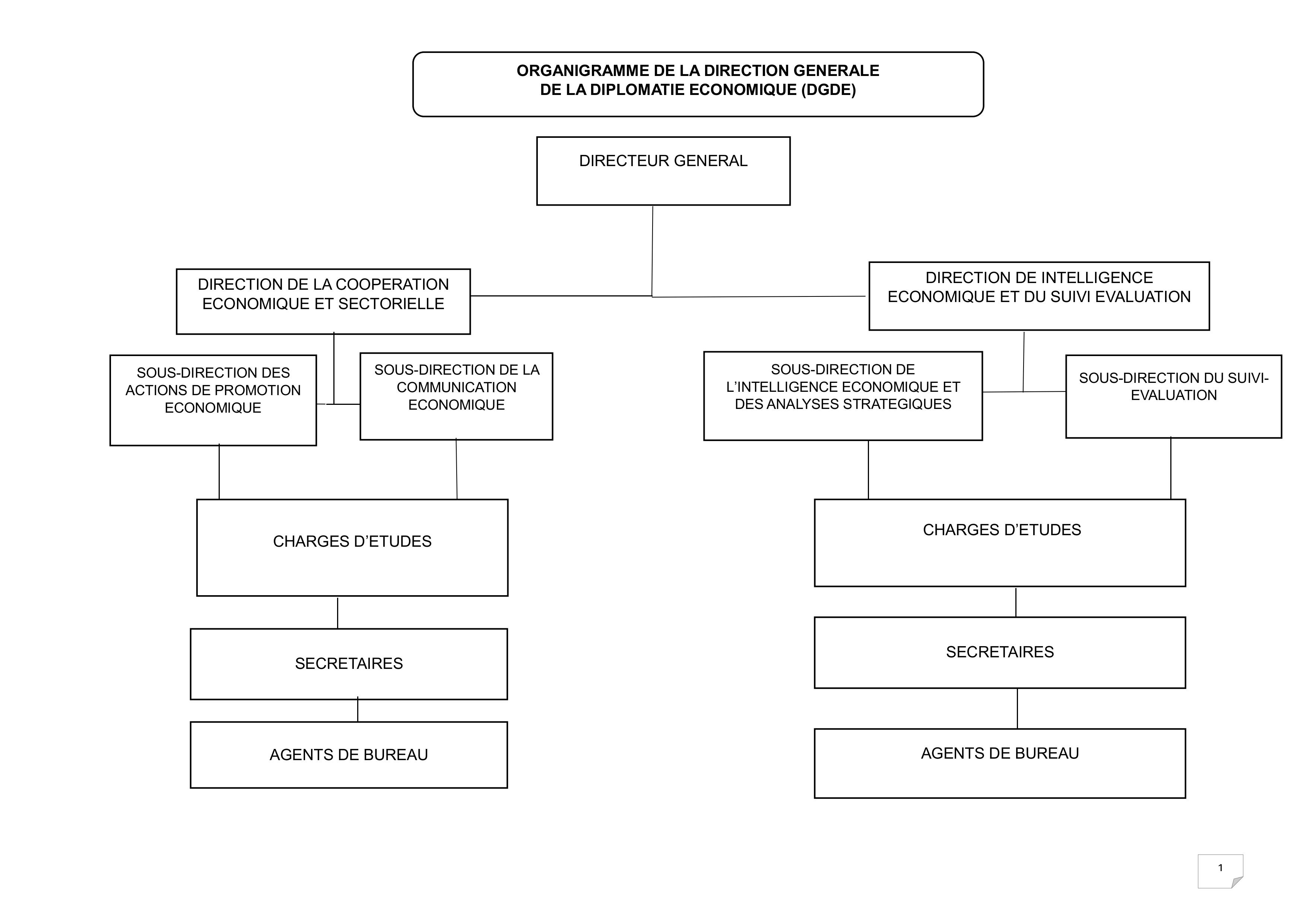 Il faut souligner que la DGDE est dirigée par un Directeur Général nommé par décret pris en conseil des Ministres. Il a rang de Directeur Général d’Administration Centrale. La DGDE est composée de deux Directions à savoir la Direction de la Coopération Economique Sectorielle et la Direction de l’Intelligence Economique et du Suivi-Evaluation. Ces deux Directions sont dirigées par des Directeurs nommés par décret pris en conseil des Ministres et ont rang de Directeur d’Administration Centrale. Elles sont également composées de deux Sous-directions dirigées par des Sous-directeurs nommés par arrêté et ont rang de Sous-directeurs d’Administration Centrale. Ainsi, est organisée cette grande Direction où nous avons passé les trois mois de stage et avons eu le privilège d’être associé à l’exécution de plusieurs tâches.